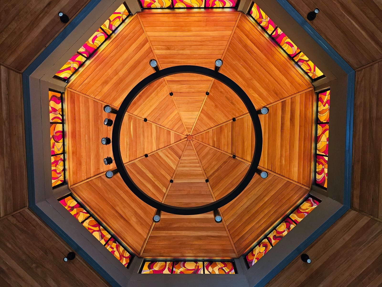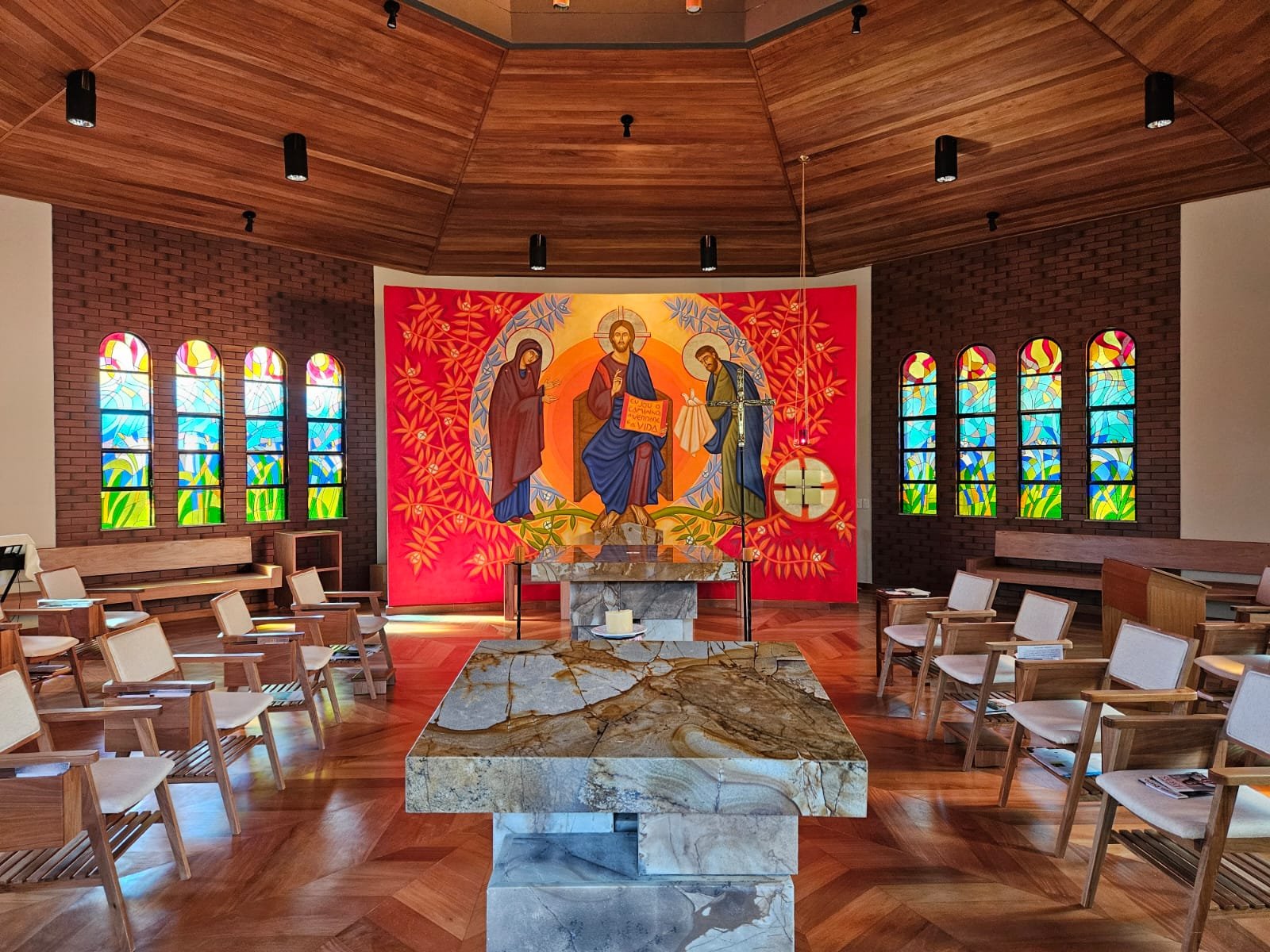 A Capela Marista em São José dos Pinhais, na região metropolitana de Curitiba‑PR, é um exemplo sensível de arquitetura litúrgica integrada à arte sacra. Inaugurada recentemente, foi projetada como um espaço acolhedor para celebrações comunitárias, com batistério funcional, vitrais que filtram a luz natural e um forro harmonioso em PVC, escolhido pela durabilidade e manutenção — oferecendo leveza estética e simplicidade estrutural