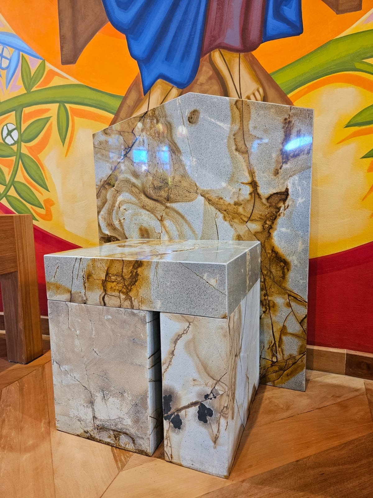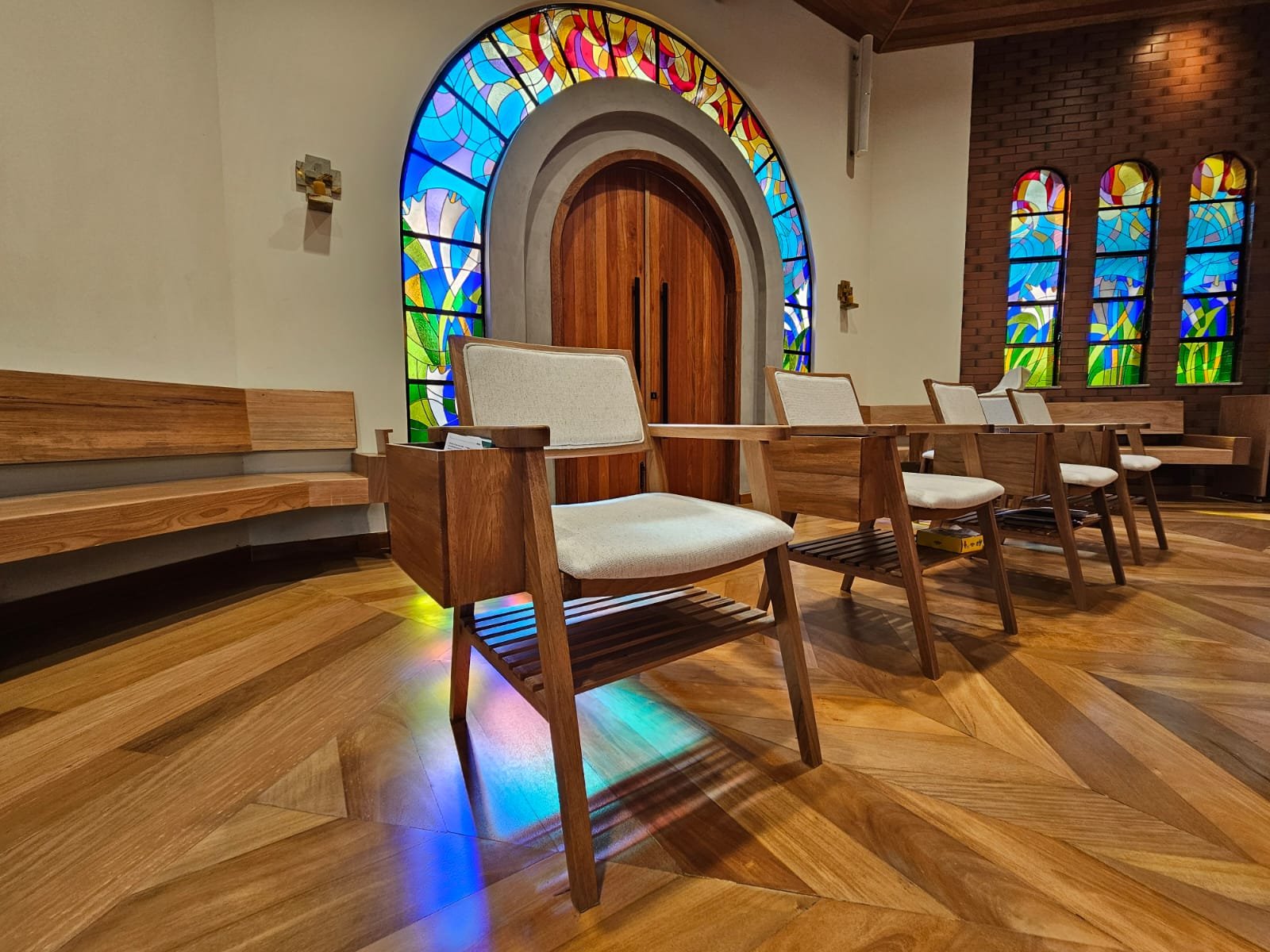 • Peças litúrgicas, destacando-se o Altar, Ambão e Sédia concebidos, além dos seus simbolismos originários, com inspiração nas edificações de São Marcelino Champagnat;
